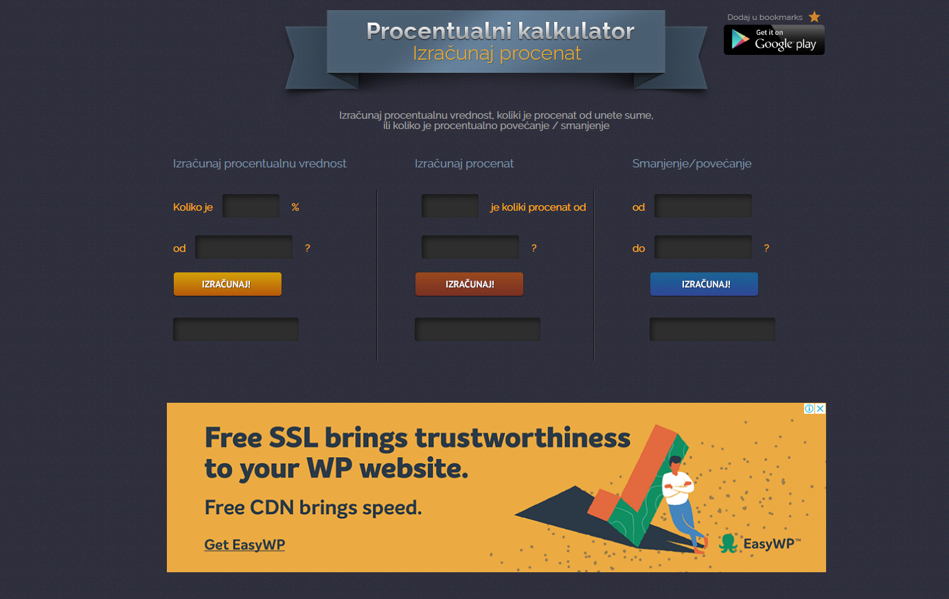 Izračunaj procenat predstavlja svojevrsan online procentualni kalkulator sa kojim možete izračunati procentualnu vrednost ili procentualno smanjenje od do neke vrednosti.